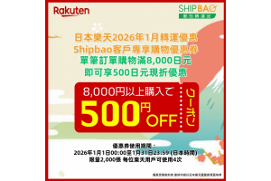 Shipbao轉運客戶單筆訂單滿8,000円 即可享500円購物優惠 優惠券使用期間 :   2026年1月1日00:00-1月31日23:59(日本時間) 領券連結(限量2,000張, 每位樂天用戶可使用4次) :  https://b.link/SBRTCoupon202601 詳情請瀏覽【樂天優惠活動】  https://tw.shipbao.com/information/rakuten