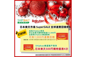 活動期間註冊成為Shipbao會員, 於日本樂天購物單筆滿15,000円並使用Shipbao日本倉轉運服務, 可享1,000円運費回贈