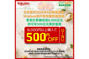 Shipbao轉運客戶單筆訂單滿8,000円 即可享500円購物優惠 優惠券使用期間 :   2026年4月1日00:00-4月30日23:59(日本時間) 領券連結(限量2,000張, 每位樂天用戶可使用4次) :  https://b.link/SBRTCoupon202604 詳情請瀏覽【樂天優惠活動】  https://tw.shipbao.com/information/rakuten