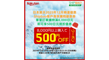 Shipbao轉運客戶單筆訂單滿8,000円 即可享500円購物優惠 優惠券使用期間 :   2025年11月1日00:00-11月30日23:59(日本時間) 領券連結(限量2,500張, 每位樂天用戶可使用4次) :  https://b.link/SBRTCoupon202511 詳情請瀏覽【樂天優惠活動】  https://tw.shipbao.com/information/rakuten