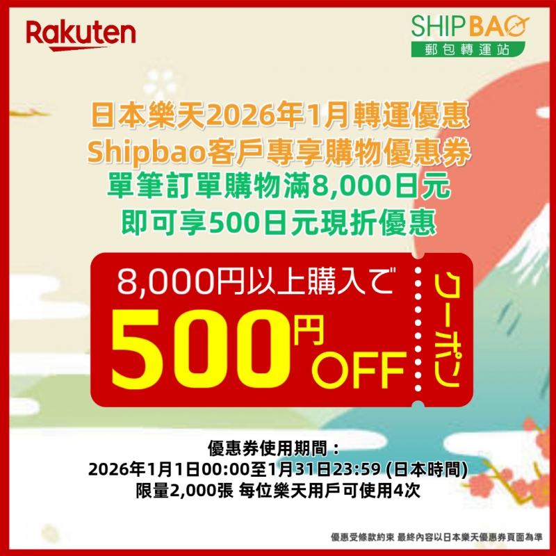 Shipbao轉運客戶單筆訂單滿8,000円 即可享500円購物優惠 優惠券使用期間 :   2025年12月1日00:00-12月31日23:59(日本時間) 領券連結(限量2,500張, 每位樂天用戶可使用4次) :  https://b.link/SBRTCoupon202512 詳情請瀏覽【樂天優惠活動】  https://tw.shipbao.com/information/rakuten