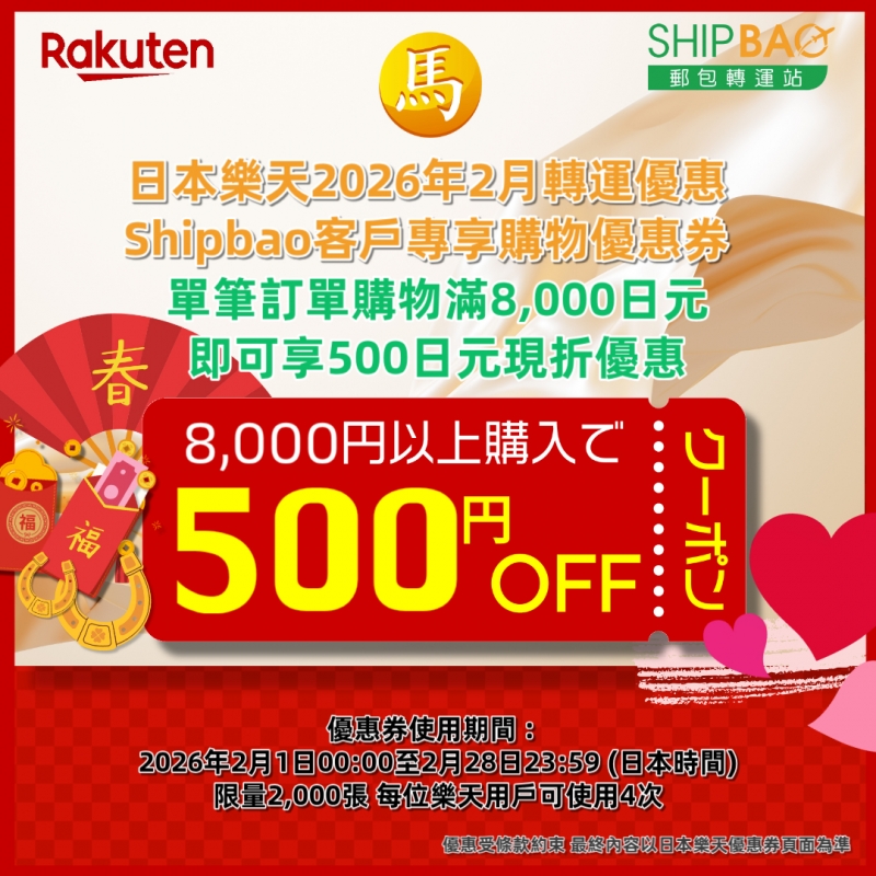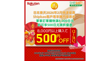 - 優惠只適用於Shipbao日本東京倉或/及日本大阪倉之日本樂天集運訂單, 合併日本非樂天訂單或合併其他國家集運訂單均不可享優惠