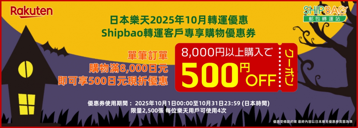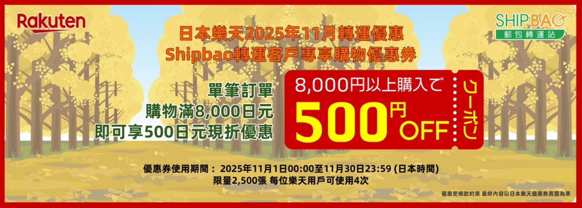 Shipbao轉運客戶單筆日本樂天訂單滿8,000円, 可享500円現折優惠