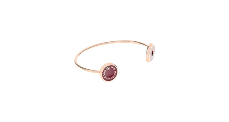 開口形手鐲,便於配戴,兩個開口飾有不同的配件,其中一邊是 Marc Jacobs 招待圓牌,另一邊則是水晶配飾。 香港售價:HKD970 Zappos