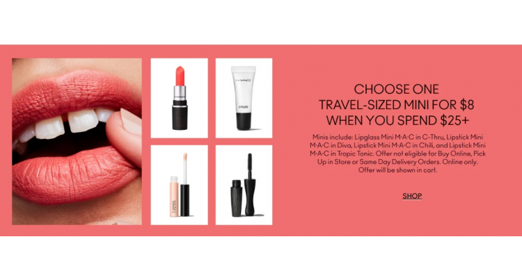 只要購物滿$25,就可以以$8加購一件旅行裝MAC產品,可選Lipglass/Mini M∙A∙C in C-Thru,